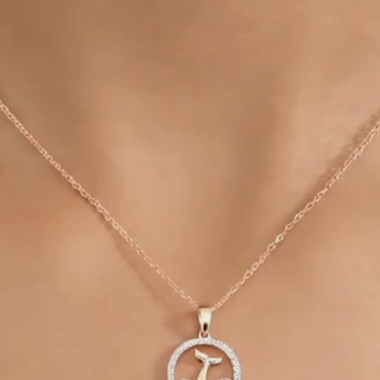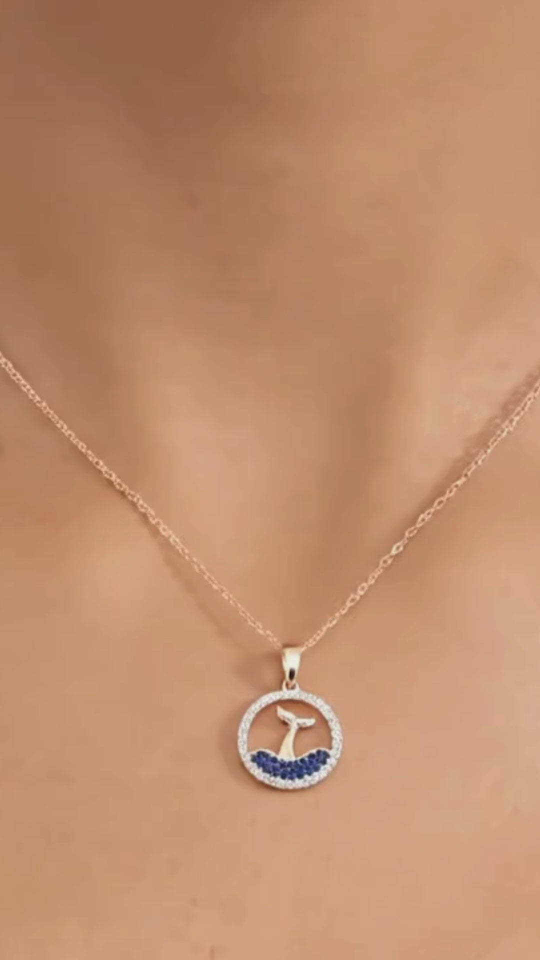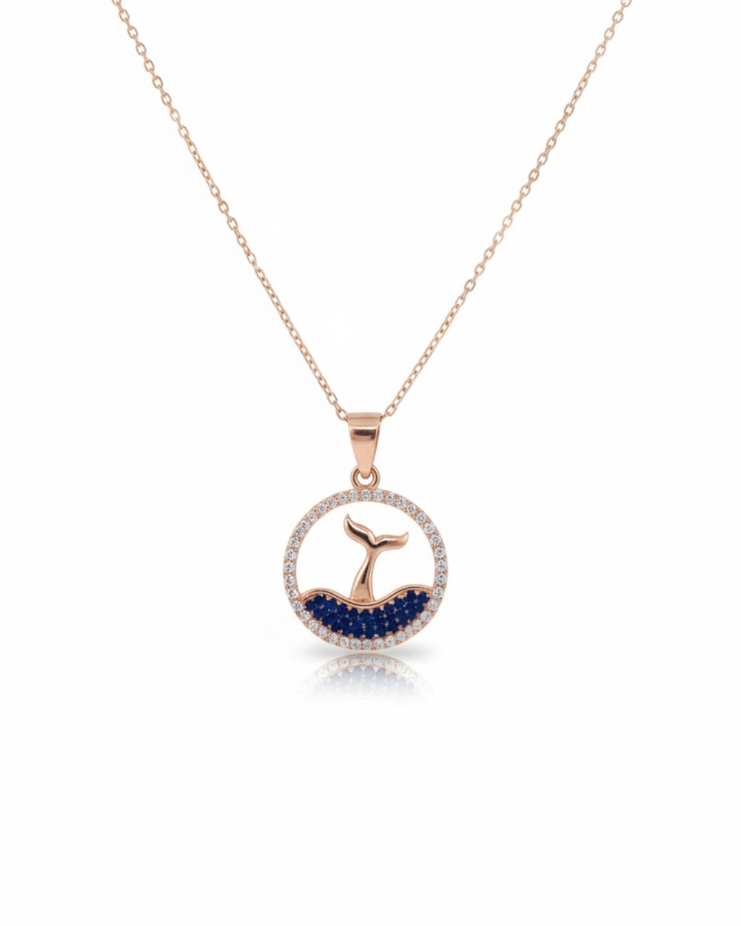 This exquisite 925 Sterling Silver pendant necklace features a delicate whale tail rising over deep blue stone-studded waves, framed by sparkling clear stones in a warm rose gold tone. Its fine matching chain and minimal ocean-inspired design make it perfect for daily wear or dressing up casual and formal outfits. Hallmarked 925 Sterling Silver ensures lasting quality, making it an ideal gift for women and girls who love ocean-inspired jewelry. Buy online and add a subtle, elegant statement piece to your jewelry collection.
