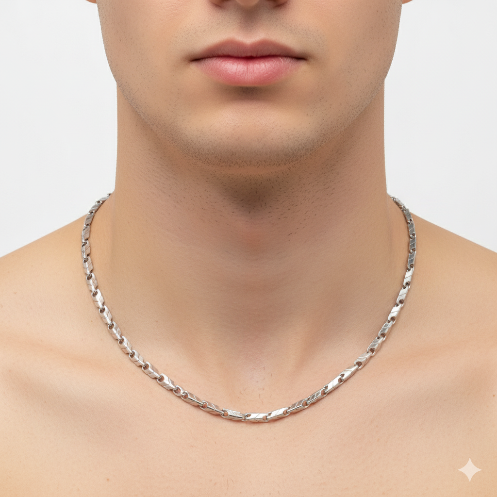 The Chevron chain is a distinctive and eye-catching design. It is substantial enough to be worn alone as a statement piece but can also be layered with other necklaces for a more textured look.
