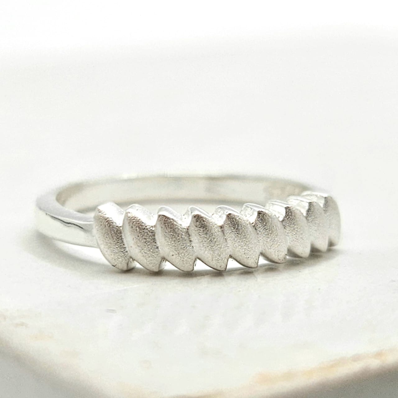 The ring is made of silver and has a minimalist style. The central design consists of several connected chevrons, each with a soft texture, giving the ring a modern yet subtle look.