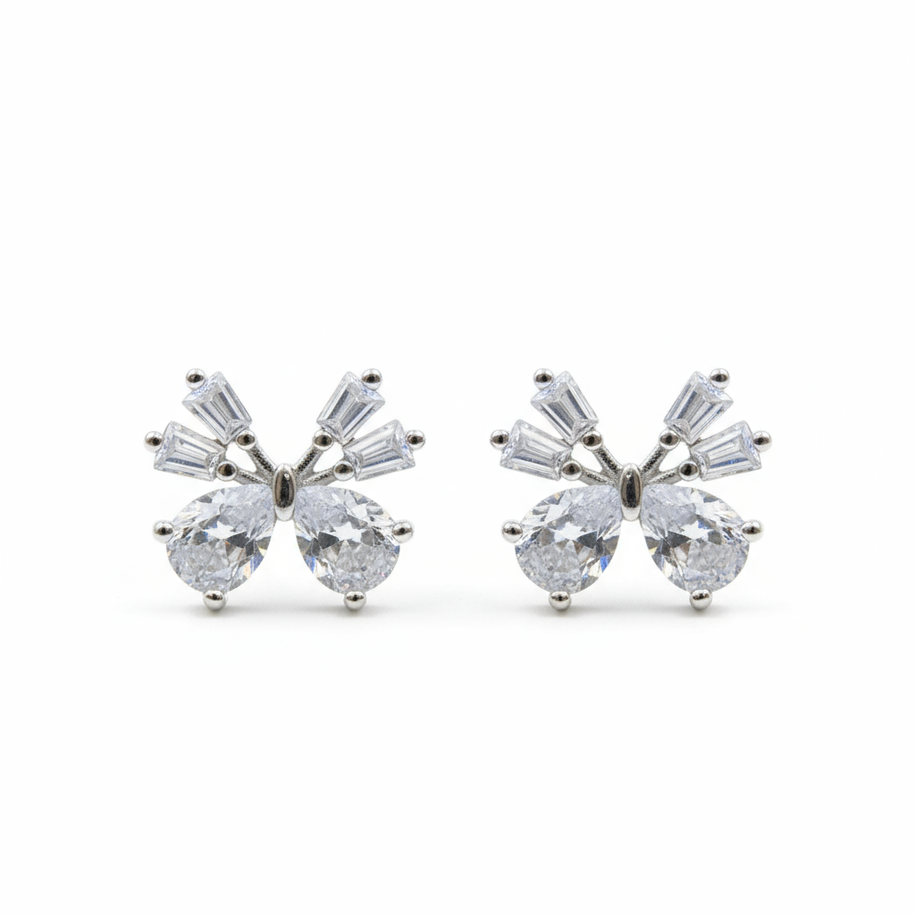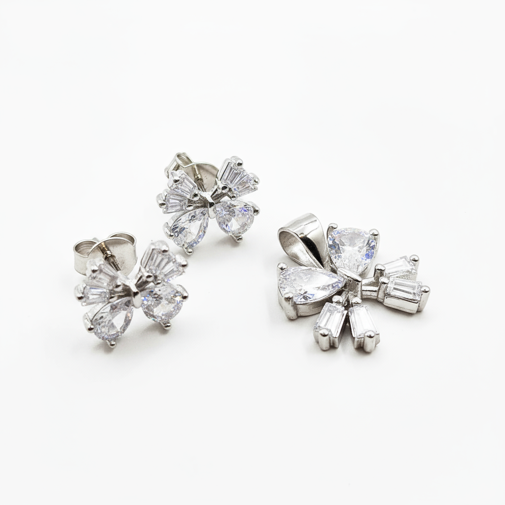 It includes a pair of stud earrings and a matching pendant, both crafted in 925 silver. The designs feature sparkling cubic zircon stones arranged in a floral motif, with each piece showcasing pear-shaped and baguette-cut stones for a multi-dimensional, brilliant effect.