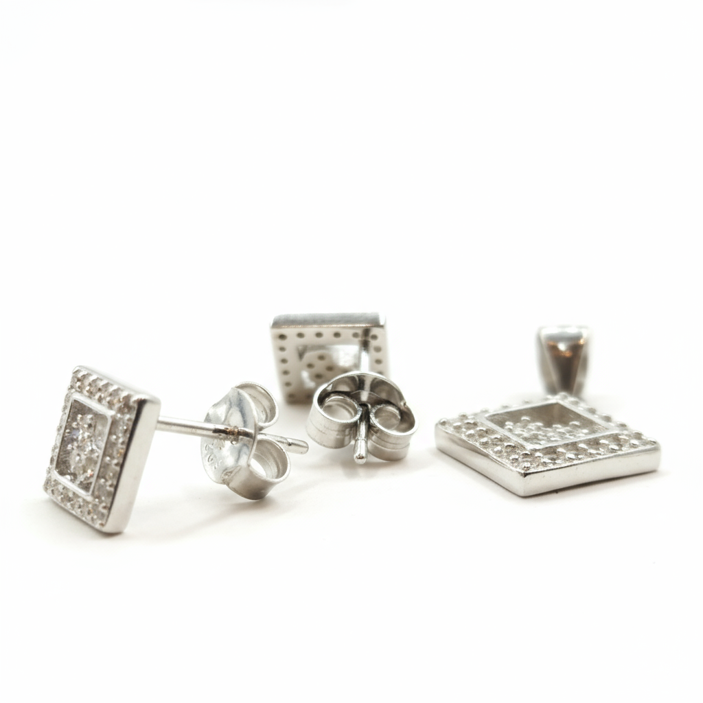 The design features a modern geometric square frame encrusted with sparkling stones, making it ideal for both daily and festive wear. The set includes a pair of stud earrings and a matching square locket, all photographed on a white background for a clean and elegant presentation.