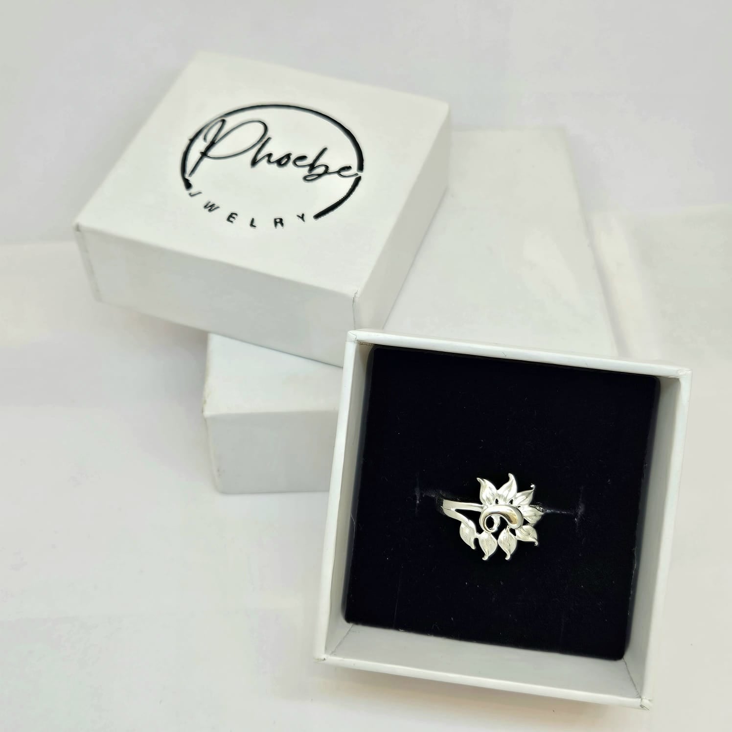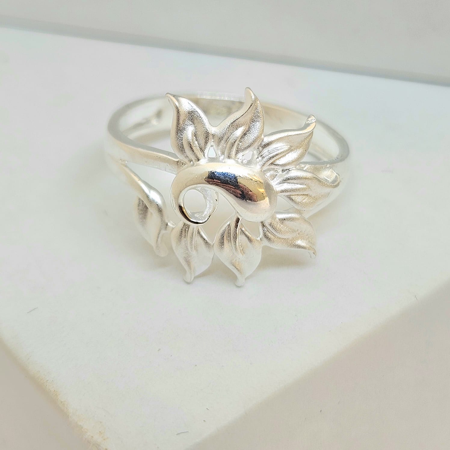 The centerpiece of the ring is a stylized, sculptural figure resembling a peacock. The head of the peacock is represented by a highly polished, swirling element, while its fanned tail is crafted from multiple, pointed, feather-like shapes with a contrasting matte or brushed finish.