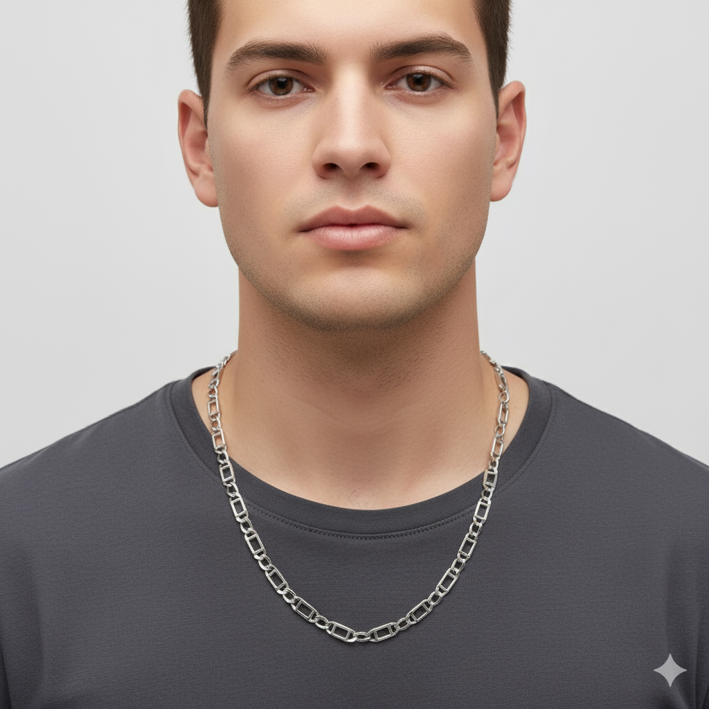 The chain has a contemporary and geometric aesthetic. The combination of different link sizes and shapes gives it a unique texture and visual interest. It has a high-polish finish, which reflects light and gives it a bright, shiny appearance.