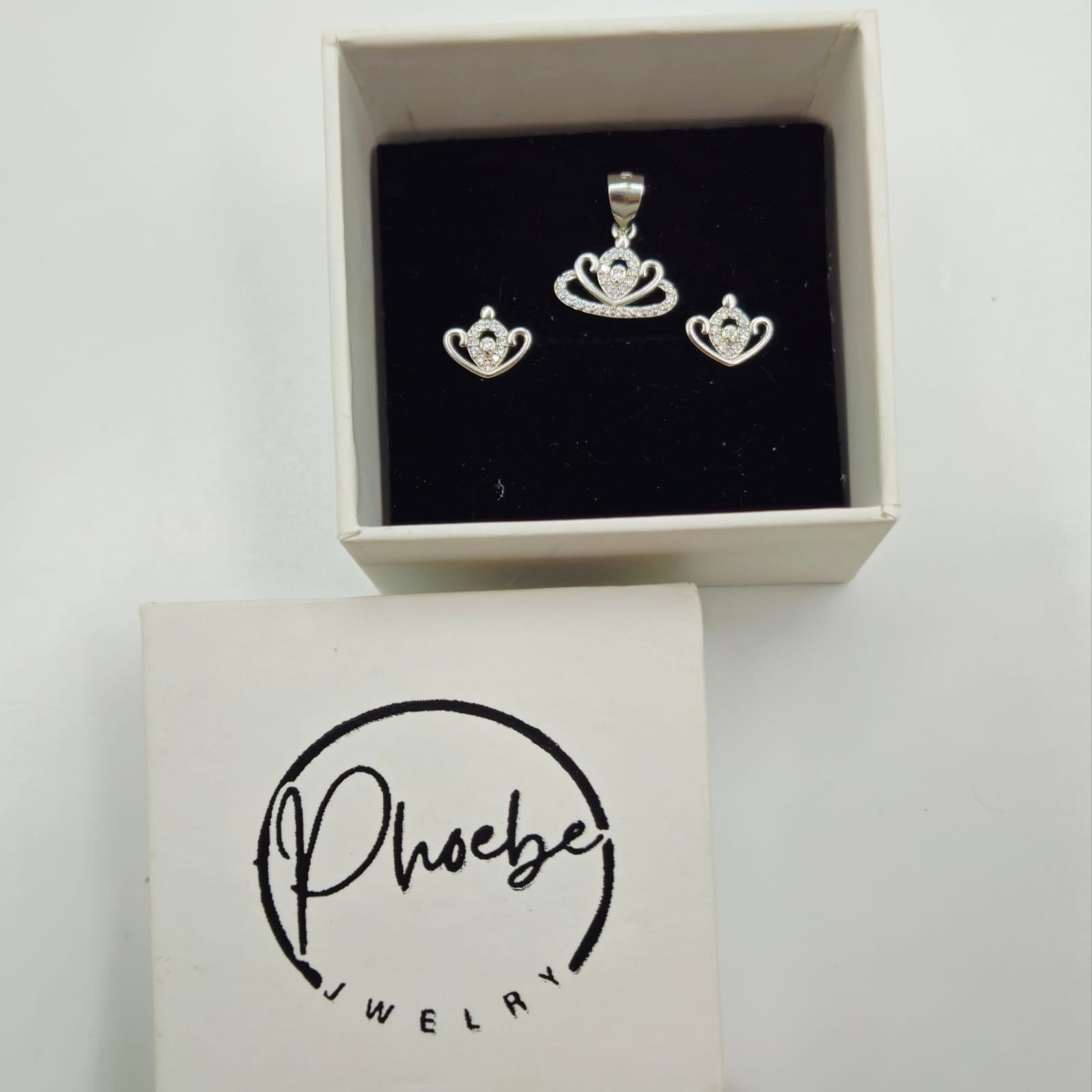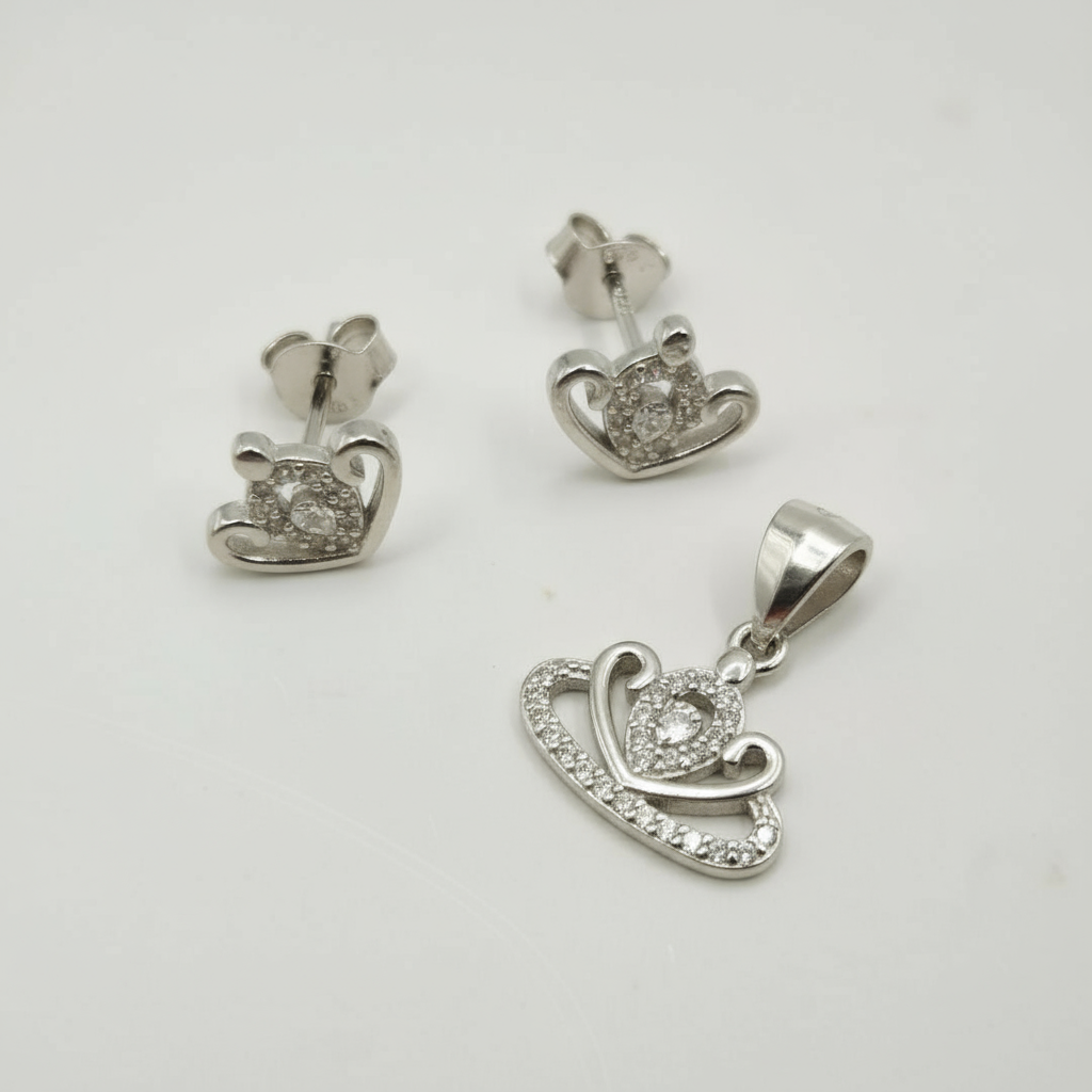 The design features a stylized crown motif with heart-shaped elements, adorned with sparkling stones set in the center and along the curves. The earrings have a secure post backing, while the pendant is accompanied by a polished bail for use with a chain. The overall aesthetic is elegant and regal, suited for occasions where a touch of royalty or sophistication is desired.