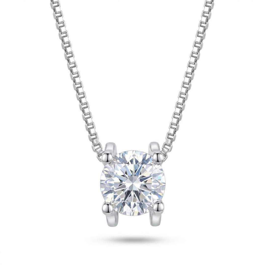 This elegant pendant offers a modern twist on the classic solitaire design. The distinctive crown setting adds a touch of architectural charm, elevating its timeless appeal. Crafted in high-polish sterling silver, it beautifully captures light from every angle, making it a versatile piece perfect for any outfit or occasion.