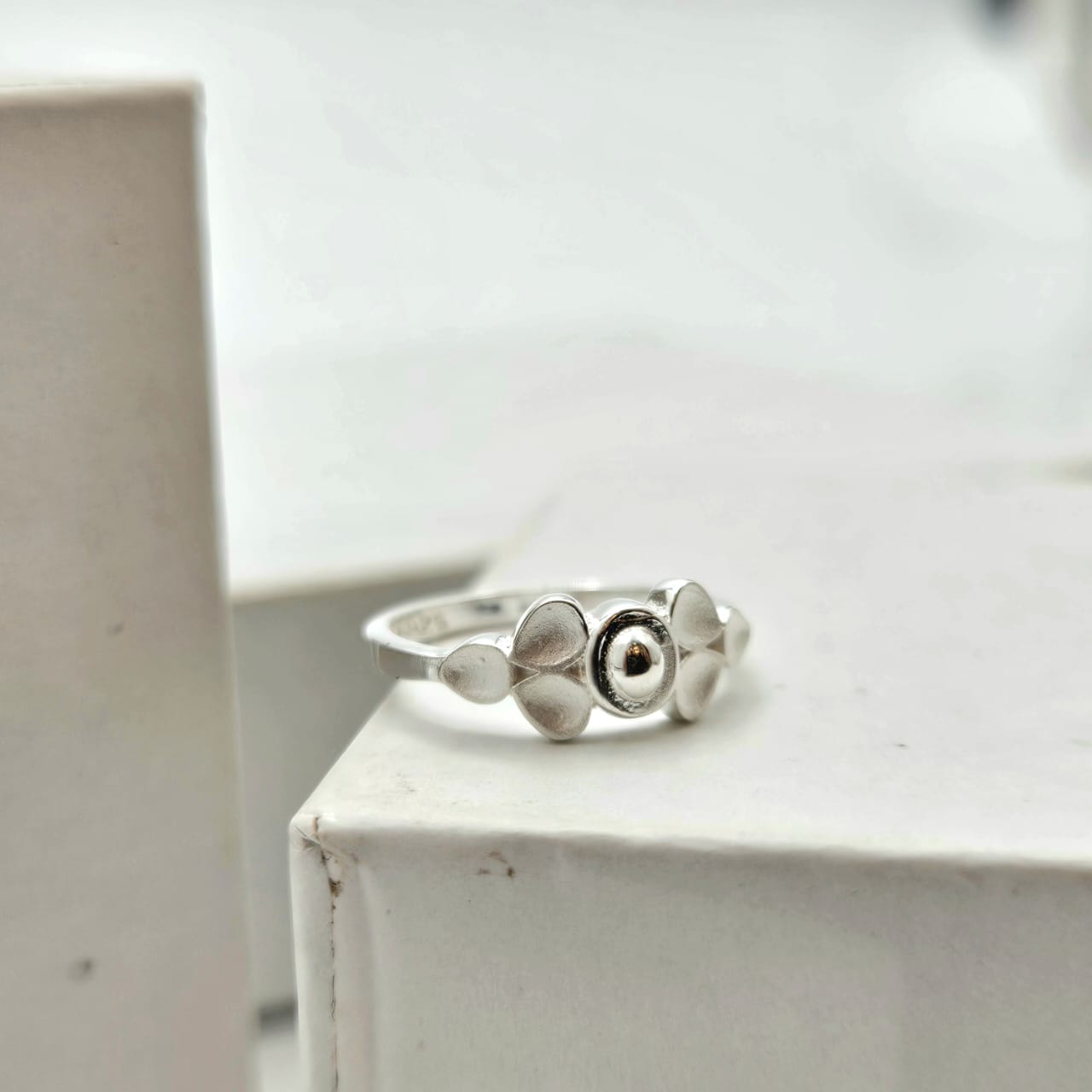 The ring features a symmetrical design with a central focal point. Its overall aesthetic is minimalist and contemporary, with elements that evoke natural forms like flowers or leaves.