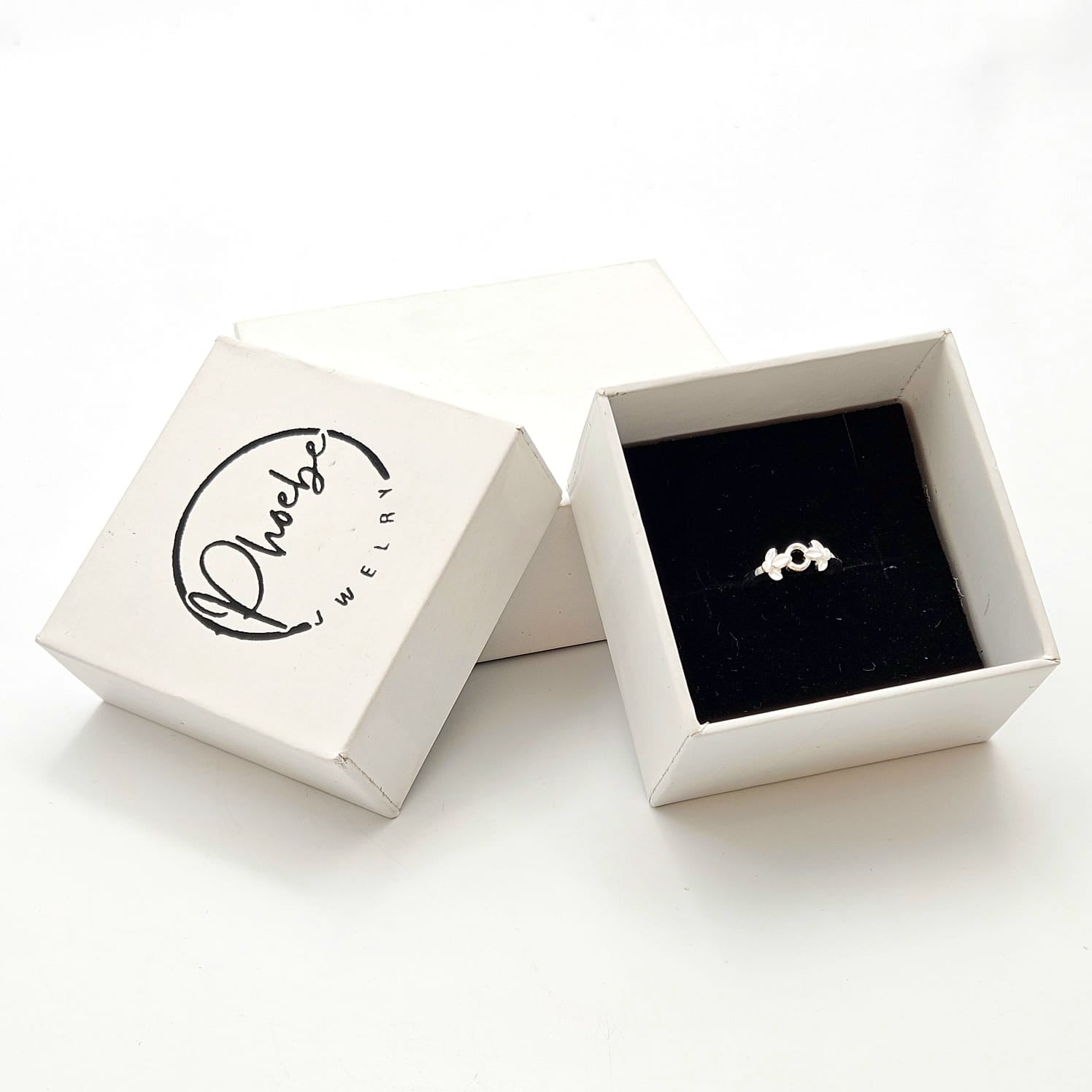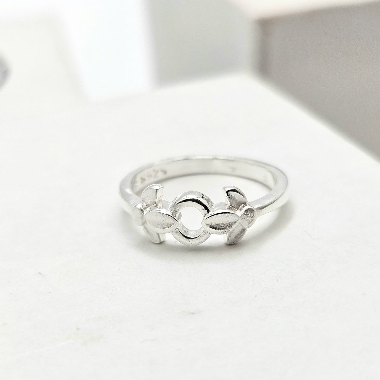The ring features a simple, slender band, characteristic of jewelry made for babies or young children. The centerpiece of the ring is a symmetrical design with a central open circle, flanked on either side by shapes that resemble butterfly wings or flower petals.